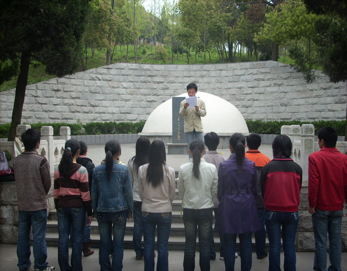 为了配合党校的学习,提高同学们的政治思想觉悟,加强同学们的爱国主义情感,必一运动第八期党校培训班第二学习小组于4月12日上午8:30准时在生化楼门口集合,在小组长的统一安排下,迈着整齐的步伐,怀着对革命先烈的无限崇敬,前往赭山戴安澜墓进行主题为“缅怀先烈,勿忘国耻”的党课实践活动。来到戴安澜墓碑前,同学们自觉地排好队,一种莫名的神圣感油然心头。小组长作了简要的发言,宣布本次活动的主题和活动的安排,之后由员工代表胡瑜同学向大家详细介绍了戴安澜将军的生平事迹,大家听得非常认真,思绪仿佛又回到了那战火纷飞的年代,革命先烈们为了国家的独立、人民的解放不惜抛头颅,洒热血,用生命和鲜血捍卫了中华民族的尊严,回顾那段屈辱的历史,同学们心中无限愤慨,落后就要挨打的真理在任何时代任何民族都不会过时,只有我们国家强大了,人民富裕了,我们的民族才能赢得尊严,赢得荣誉。随后由张敏和徐媛两位同学代表我们第二学习小组向戴安澜墓敬献了鲜花,同学们真诚地向将军鞠躬致敬,然后大家在墓碑前展开了“爱国主义”的讨论,有的同学谈到了当前的达赖事件,大家纷纷表示维护祖国的统一是每个炎黄之孙的义务和职责,那些蓄意破坏国家统一、人民团结的恶劣行径是不得人心的,势必会失败的。我们要继承革命先烈的遗愿,努力学习,追求上进,为祖国的繁荣昌盛贡献自己的力量。