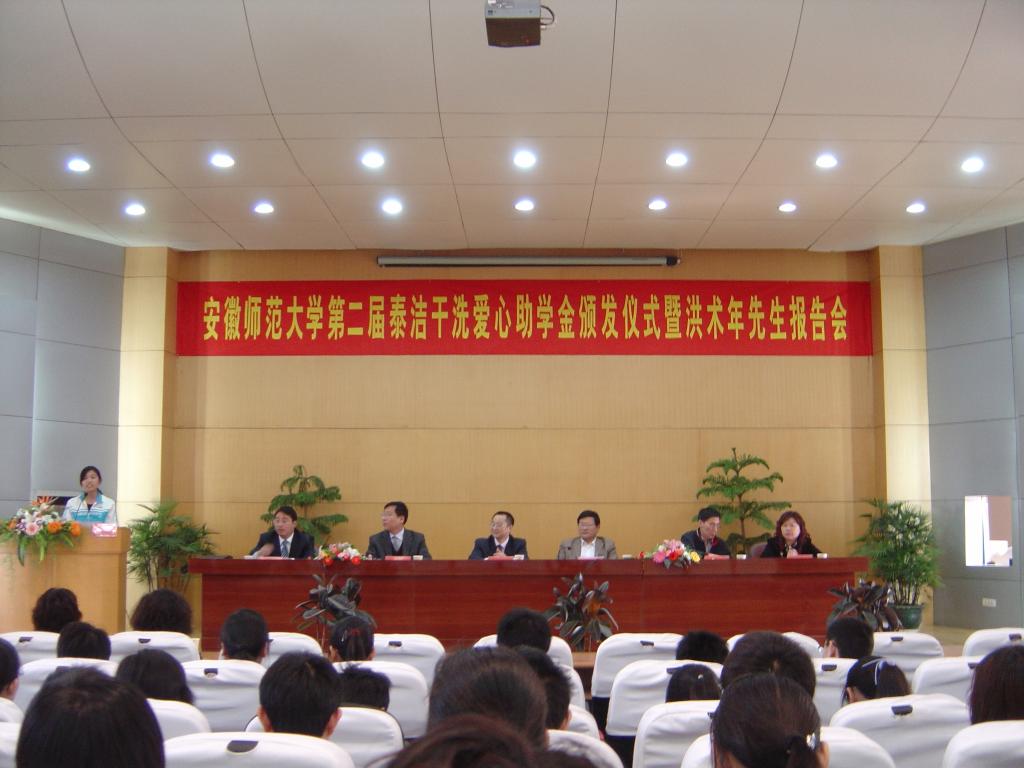 颁发仪式结束以后,上海泰洁集团公司董事长、总经理洪术年先生结合自己的创业历程给现场的同学做了一场 “就业创业报告会”。洪先生结合实例分别从自己的创业之路、老员工就业与创业问题的比较与选择、对当前老员工的创业规划思路和建议等几个方面做了一场指导性、针对性和实践性都很强的精彩报告。报告会结束后,洪先生还与现场同学进行了互动,对于每位同学的提问,洪先生都详细地给予了回答,同时,洪先生还邀请愿意加入到泰洁公司的同学去公司见习和工作。报告会在热烈的掌声中圆满结束。下午3点,洪先生还与两届受助同学在生化楼门口合影留念。