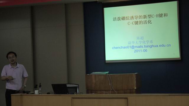 陈超博士作了题为“活泼硼烷诱导的新型C-H键和C-C键的活化”的学术报告。他主要介绍了他攻读博士期间的科研工作,即活泼的硼烷能诱导活化C-H键和C-C键发生氧化偶联反应,从而很好的取代以往只能用过渡金属催化的有机反应。报告中,陈博士深入浅出地诠释了高水平的科研成果,整个报告会图文并茂、精彩纷呈,受到与会师生的阵阵掌声。会后,陈博士还与师生们进行了广泛地学术交流。