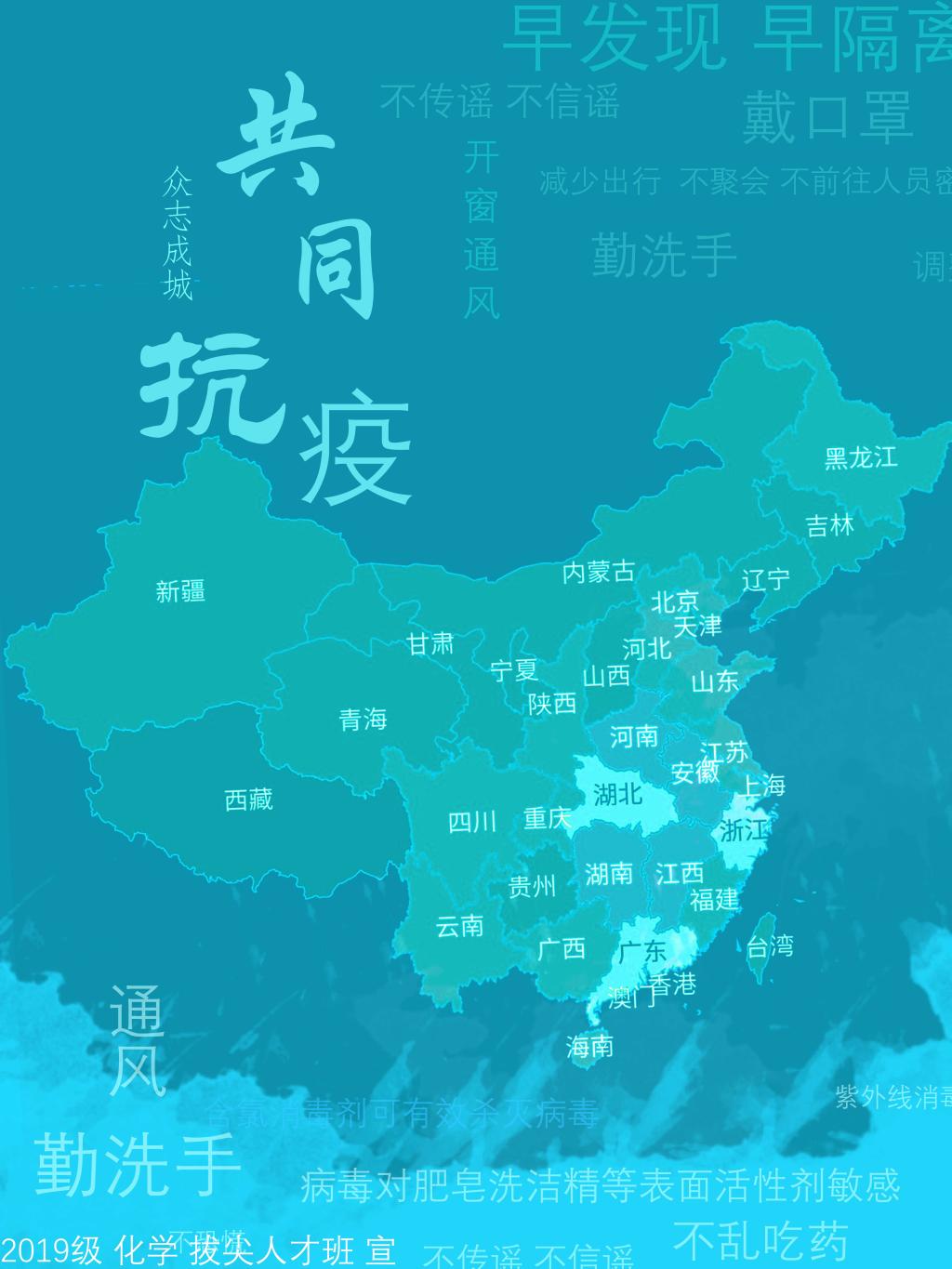 轻触笔尖以“艺”抗疫,化材学子携手共战。在抗击新冠肺炎疫情的战役中,化材学子虽不能冲上一线与病毒抗争,但始终心系前方疫情。公司积极发动青年先锋,以班级为单位,为武汉传递爱与温暖。青年学子全员行动,用手写文字传递祝福,共克时艰;用海报的形式礼赞英雄,传达敬意;用电子“微板报”形式宣传疫情知识,提高认识;用自制视频的形式传递满满正能量,为武汉加油。抗击疫情你我共行,防疫攻坚众志成城。大家随身处各地,但心系一处,相信病与伤痛终将逝去,企盼共迎春暖花开。